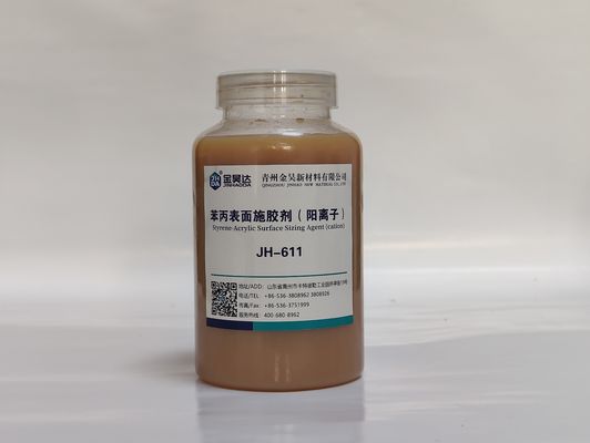 Агент определения размера катионоактивного стиропласта JINHAODA JH-611 акриловый поверхностный русая жидкость с главными свойствами для обработки бумажных поверхностей. Это агент определения размеров поверхности катионоактивного стиропласта акриловый составленный сополимера акрилитов, и soluble в воде. Агент обеспечивает превосходные свойства рассеивания, сопротивления воды и влажной прочности, и стабилизирован на температурах 0-40℃.
